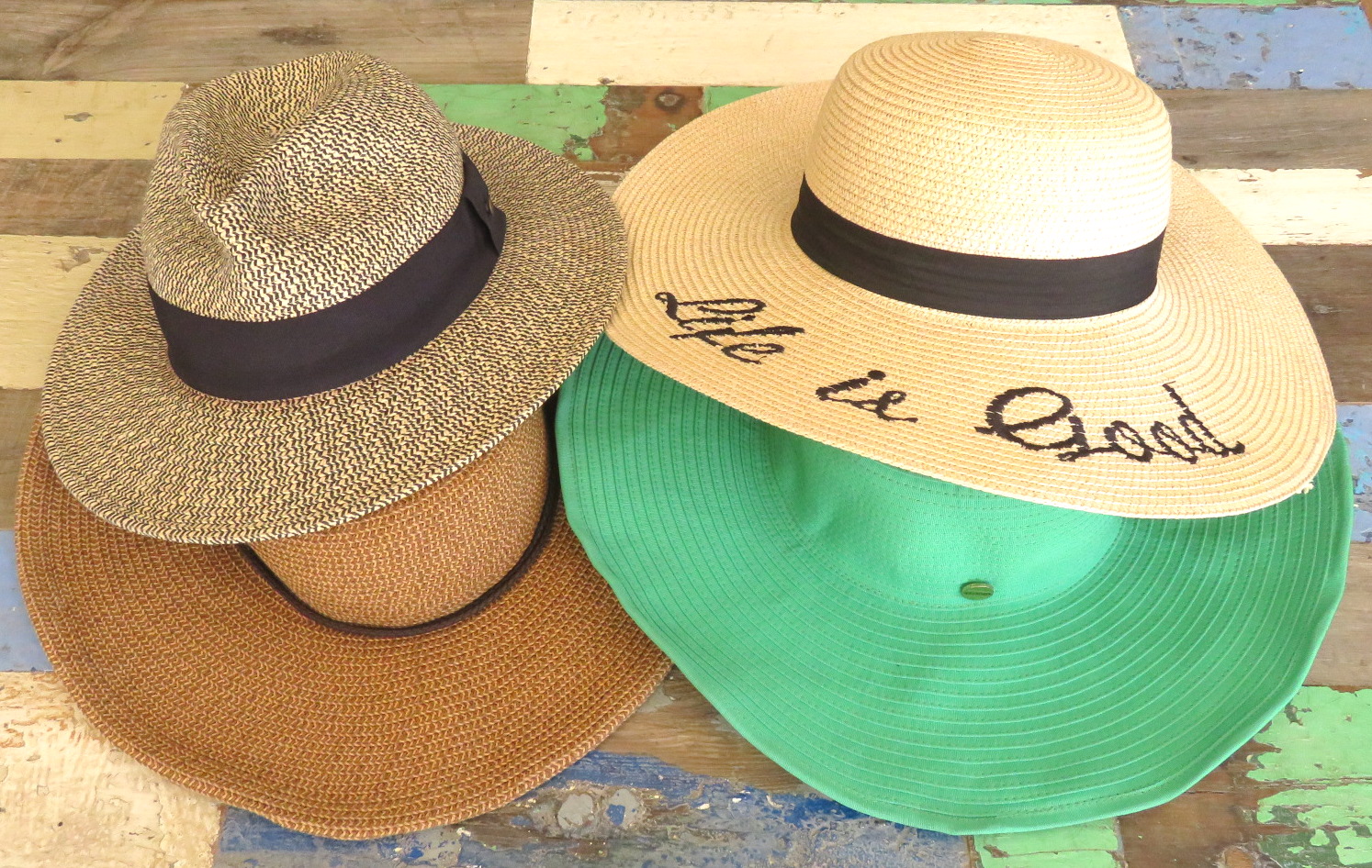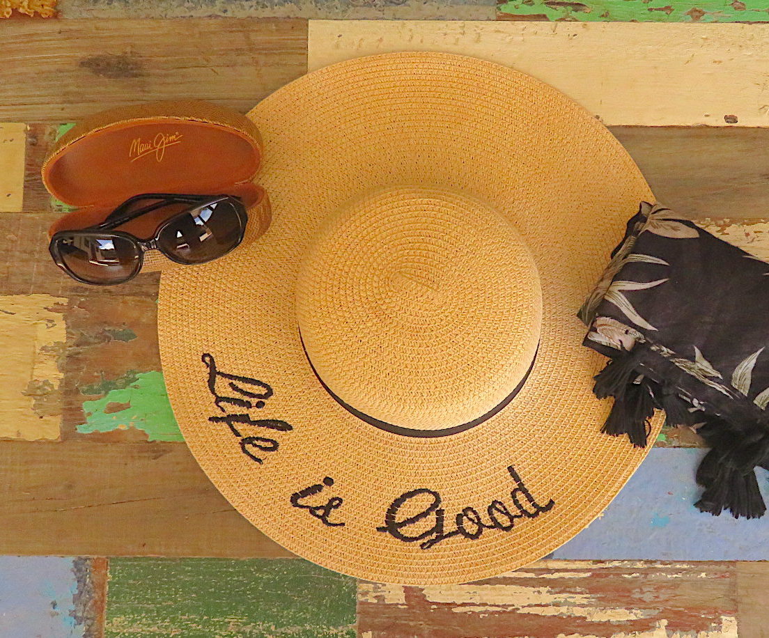 A good hat is essential. The last thing any of us want is skin cancer and wrinkles (or more of them)! I have enough sun damage from Costa Rica to last me a lifetime and that was mostly from when I was driving in the car. I would always put sunscreen on but my left side of my face/neck/chest got it the most so I’m very aware of protecting myself from the sun. Here are four of my hats that I use whenever traveling to a warm weather destination. The top two I tend to wear in cities more and the bottom two I tend to wear in the pool as they can get wet. The bottom two are more geared towards that and stand up to being wet and maintaining their shape. Far left photo: Top 2-neither of these were bought online. The closest I could find for you are these: Panama Hat, Straw Hat with Saying. Bottom 2 in that photo are Scala Brand & SeaFolly.